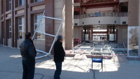 Yaklaşık 10 metre yüksekliğindeki cam kapının düşmesi sonucu maddi hasar meydana geldi. Kapının düştüğü alanda kimsenin olmaması büyük bir faciayı önledi.