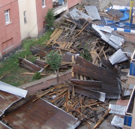 Dün öğle saatlerinde başlayan ve bugün de etkisini sürdüren yağış rüzgarın da etkisi ile Bulak Mahallesi Konak Caddesi'deki maliye lojmanlarının çatısında hasara yol açtı. Emniyet müdürlüğü personelline ait 80. yıl polis lojmanının bahçesine düşen çatıdaki sac parçaları vatandaşlar arasında paniğe sebebi oldu. Olay sırasında sokakta kimsenin olmaması can kaybını önledi.