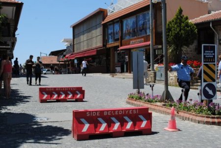 Side Belediyesi, turistlerin tarihi çarşı içinde rahat bir şekilde dolaşması ve alış veriş yapabilmesi için gündüz araç girişini yasakladı. Belediye, yaşlı ve yürüme engelli turistlerin tarihi çarşı içinde Side Limanı ve Apollon Tapınağı'na görebilmesi için 2 golf arabasını antik tiyatro önünde hazır bulunduruyor. Kartı bulunan esnaflar, tarihi çarşı içine araçla belirli saatlerde giriş ve çıkış yapabiliyor. Side Belediye Başkanı Abdulkadir Uçar, uygulamadan ötürü geçen yıl turistlerden çok sayıda teşekkür aldıklarını kaydetti.