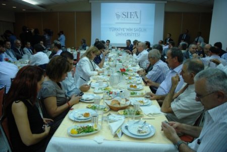 İftar programı, sinevizyon gösterisiyle başladı. Daha sonra kürsüye çıkan Rektör Erdoğan, Şifa Üniversitesi hakkında bilgi verdi. Prof. Dr. Erdoğan, "Büyük bir heyecanla cuma gününü bekliyoruz. Öğrenciler, cuma günü sonuçlarını öğrenecek. Biz de Şifa Üniversitesi olarak tıp, diş ve sağlık bölümlerimize 250 öğrenci alacağız. Bilgilerimize göre çok seviyeli öğrenciler gelecek, bu da hocalarını yoracak. Bizi tercih etme sebeplerini bir yıl sonra göstereceğiz. Belki Türkiye'de ilk defa uygulanabilecek anatomi tekli bir sistemi getireceğiz. Bunun dışında da farklı bir tıp eğitimi programı uyguluyoruz." dedi.