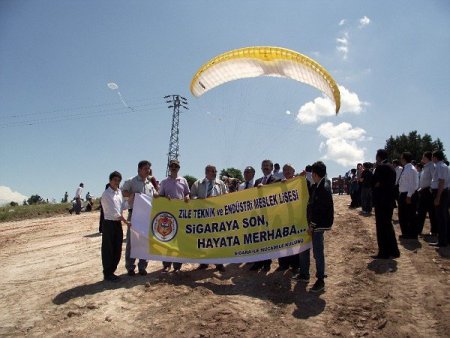 Tokat’ın Zile ilçesinde Anadolu Teknik Lisesi, Teknik Lise ve Endüstri Meslek Lisesi öğrencileri 'Sigaraya son, hayata merhaba' sloganıyla uçurtma şenliği düzenledi. Şenliğe katılan yamaç paraşütü ekipleri de 'sigarasız hayat' için birer gösteri uçuşu yaptı.
