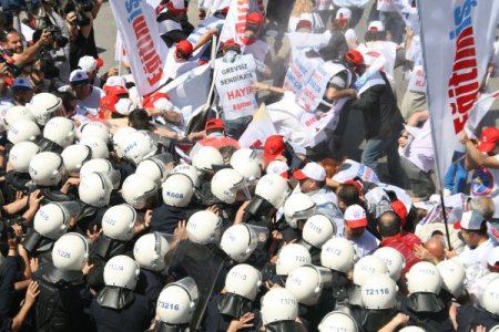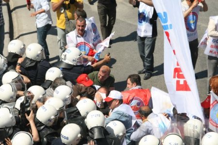Bazı göstericiler, polise plastik şişe fırlattı. Sendika üyeleri daha sonra, bulundukları yerde oturma eylemine başladı. CİHAN