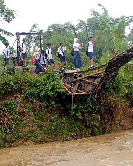 Endonezya’nın Cava adasının batısındaki Bantan eyaletinde öğrenciler, yarı yıkık köprüyü geçerek sıvana gitti. Büyük öğrenciler tehlikeli köprüyü geçmeyi başarırken, küçük öğrenciler ise uzun yolu tercih ediyor.