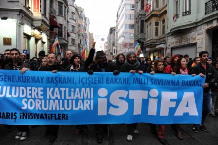 Galatasaray meydanında toplanan ve kendilerine ‘Barış İnisiyatifleri’ adını veren yaklaşık 300 kişilik grup, Şırnak Uludere’de 35 kişinin hayatını kaybetmesini protesto etti. ‘Uludere Katliamı Sorumluları İstifa’ yazılı pankart açan eylemciler, hükümet aleyhine slogan attı. Grup adına yapılan basın açıklamasında, olayda sorumluluğu olduğunu ileri sürdükleri Genelkurmay Başkanı, Milli Savunma Bakanı ve İçişleri Bakanı’nın istifa etmesi istendi.