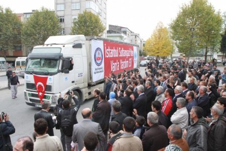 Törenin ardından yardım malzemelerini taşıyan tırlar dualar eşliğinde Van’a doğru uğurlandı.
