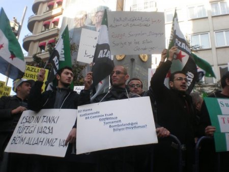 Türkiye'de yaşayan bir grup Suriyeli, Nişantaşı'ndaki Suriye Başkonsolosluğu önünde toplandı. 'Suriye halkı yalnız değildir', 'Suriye Türkiye tek yürek' şeklinde slogan adan grup, 'Esad'ın tankı varsa bizim Allah'ımız var' yazılı dövizler taşıdı. Arapça ve Türkçe slogan atmaya devam eden grubun eylemi sırasında polis ekipleri de geniş güvenlik önlemi aldı.