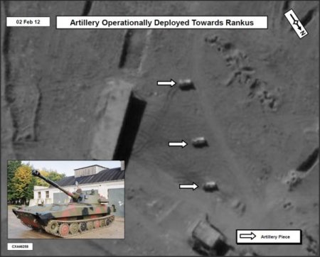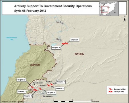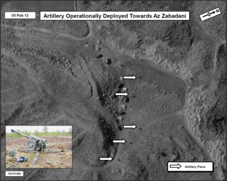 2, 5 ve 8 Şubat’ta elde edilen uydu fotoğraflarında ise topçu birliklerinin, başkent Şam yakınlarındaki Az - Zabadani, Halbun ve Rankus bölgeleri ile Humus kentine çevrilmiş oldukları görülüyor. Fotoğrafların, yeryüzünden 480 kilometre yükseklikteki iki uydu tarafından çekildiği belirtiliyor.