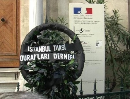 Fransa Ulusal Meclisi’nde sözde Ermeni soykırımıyla ilgili yasa tasarısının kabul edilmesine bir tepki de İstanbul’daki taksicilerden geldi. Fransa’nın İstanbul Başkonsolosluğu önünde toplanan taksiciler konsolosluk önüne siyan çelenk bıraktı.
