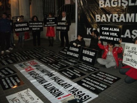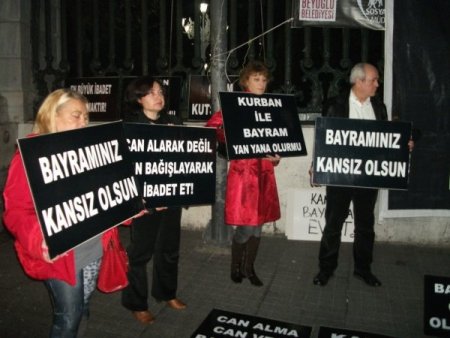 Galatasaray Lisesi önünde toplanan eylemciler, hayvanların kesilmesini protesto etti. ‘Kurban paralarını ihtiyaç sahiplerine bağışlayın, bayramınıza kan bulaşmasın’ , ‘Bayramınız kansız olsun’ , ‘Bayramda cellat olmayalım’ , ‘En büyük ibadet yaşatmaktır’ , ‘Can alma can ver bayram et’ , ‘Kansız ibadete evet’ , ‘5199 nolu hayvan hakları yasası TCK kapsamına alınsın’ yazılı pankart ve dövizler açan yaklaşık 15 kişilik grup oturma eylemi yaptı.