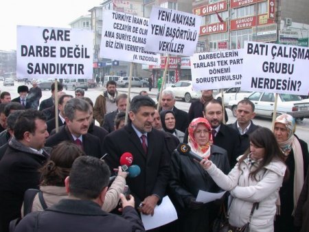Büyük Birlik Partisi (BBP) Genel Başkan Yardımcısı ve Millet ve Demokrasi Platformu Komisyonu Başkanı Remzi Çayır ile beraberindekiler, Sincan'da basın açıklaması yaptı. 'Çare darbe değil sandıktır', 'Türkiye İran olmaz, Cezayir de olmaz ama Suriye olmasına da biz izin vermeyeceğiz', 'Yeni anayasa yeni başörtülü vekiller', 'Batı Çalışma Grubu neredesin', 'Darbecilerin tarlası tek parti dönemi soruşturulsun', 'Namlusunu millete çevirmiş tanklara selam durmam' yazılı dövizler taşıdılar.