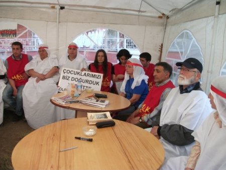 ‘Devrimci tutsaklar onurumuzdur’ , ‘Anaların öfkesi katilleri boğacak’ , ‘Halkız haklıyız kazanacağız’ , ‘Baskılar bizi yıldıramaz’ , ‘Tecrite son’ , ‘Sohbet hakkı uygulansın’ şeklinde soganlar atan grup basın açıklamasının ardından açlık grevinin yapılacağı çadıra girerek eylemlerine başladı.