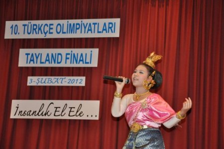 10. Uluslararası Türkçe Olimpiyatları’nın Tayland elemeleri dün Bangkok’ta yapıldı. Ülke elemelerinde final sahnesine çıkmaya hak kazanan Taylandlı öğrenciler, 3 kategoride bir biri ile yarıştı. Taylandlı öğrenciler yarışmada ülkelerini en iyi şekilde anlatabilmek için jürinin karşısına yöresel elbiselerle çıktı.