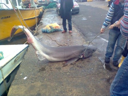 Tekirdağ’ın Marmara Ereğlisi ilçesine bağlı Yeniçiftlik beldesi açıklarında balıkçıların ağına 3 metre uzunluğunda ve 250 kilogramağırlığında Camgöz cinsi köpek balığı takıldı. Balık, kilogramı 2.5 TL'den Çanakkale'de bir restorana satıldı.