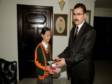 Vali Ahmet Turhan, temsili vali Leyla Ceviz’e bir adet diz üstü bilgisayar, kitap ve çeşitli hediyeler verirken, TOKİ Dumlupınar İlköğretim Okulu’na da projeksiyon cihazı hediye etti.