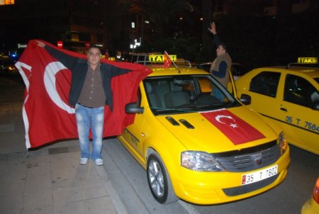 Ticari taksi sürücüleri, terör örgütünü protesto etmek için Cumhuriyet Meydanı'nda toplandı. Terör örgütü aleyhine sloganlar atıldı. Grup adına konuşan İzmir Şoförler Dayanışma ve Yardımlaşma Derneği Başkanı Özdemir Yeşildağ, "Kimse polisimizi, askerimizi şehit ederek bu ülkeyi böleceğini düşünmesin. Biz birarada kardeşçe yaşamak istiyoruz. Kurtuluş Savaşı'nda bizim dedelerimizle Kürt kardeşlerimizin dedeleri birlikte savaşarak bu ülkeyi kurtardı. Ancak bugün Amerikan ve İsrail piyonu olan bazıları polisimize askerimize kurşun sıkarak bir şey elde edeceğini zannediyor. Oysa asla amaçlarına ulaşamayacaklar" dedi.