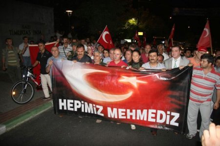 Bursa’da faaliyet gösteren 100’e yakın sivil toplum örgütünün bir araya gelmesiyle oluşturulan Hepimiz Mehmediz Güç Birliği Platformu tarafından düzenlenen yürüyüş Çakırhamam’da başladı. Meşaleler eşliğinde yürüyüşe geçen kalabalık, terör örgütü ve destekçileri aleyhine slogan attı. Atatürk Anıtı önünde İstiklal Marşı okuyan grup adına Türkiye Kamu-Sen Bursa İl Temsilcisi Selçuk Türkoğlu bir açıklama yaptı. Türkoğlu, “Kimse artık sabırdan, demokrasiden, Ramazandan, bayramdan bahsetmesin. Türk milleti göre göre vatanın bölünmesine seyirci kalmayacaktır” dedi.
