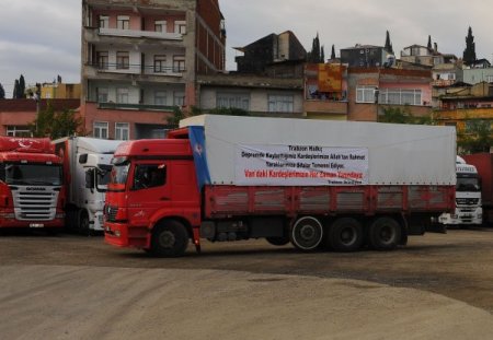Trabzon Belediyesi tarafından depremzedeler için başlatılan kampanyada toplanan malzemeler Van’a gönderildi. Battaniye, giyecek, kuru gıda, çocuk bezi, çocuk maması ve ısıtıcı gibi malzemelerden oluşan yardımları taşıyan bir TIR ve bir kamyon, bu sabah Trabzon’dan yola çıktı. Van’da kriz merkezine teslim edilecek yardımlar, depremzedelere ulaştırılacak.