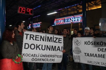 Kocaeli’nde aralarında öğrencilerin de bulunduğu bir grup, Köseköy-Gebze arasındaki tren seferlerinin durdurulması kararına tepki gösterdi. Açtıkları pankart ve yaktıkları meşalelerle slogan atarak İzmit Garı’na kadar yürüyen grup, basın açıklamasının ardından olaysız bir şekilde dağıldı.