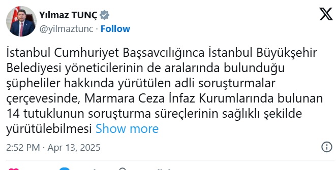 Adalet Bakanı Yılmaz Tunç, konuya ilişkin sosyal medya hesabından yaptığı açıklamada, şunları kaydetti: