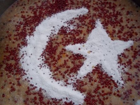 Muharrem ayı dolayısıyla Manyas esnafı aşure ikramında aşurenin üstüne Türk bayrağı yaparak herkesin dikkatini çekmeyi başardı. Her yıl yaptıkları ikramlarla vatandaşlardan takdir alan esnafın yaptığı bu ilginç ve güzel uygulama, yine herkesin beğenisini kazandı. Türk bayrağının kalıbını yaparak aşurenin üstüne koyan esnaflar hindistan cevizi, fındık ve fıstıkla Türk bayrağı motifi yaptı.