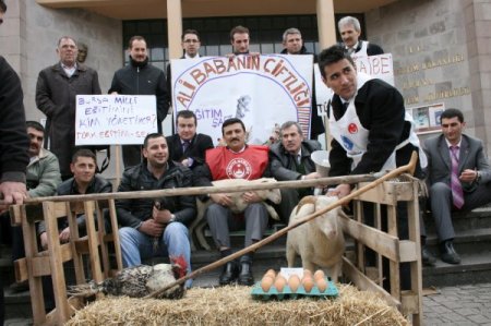 Türk Eğitim Sen Bursa 2 No’lu Şubesi, İl Milli Eğitim Müdürlüğü’nde idareci atamalarından sorumlu şube müdür vekili Ali Aksakal’ın görevden alınması için koyun ve tavuklarla protesto eylemi yaptı. Milli Eğitim Müdürlüğü önüne getirilen saman balyası, iki kuzu, tavuk, horoz ve yumurtalar ile eyle yapan Türk Eğitim Sen Bursa 2 No’lu Şube Başkanı Selçuk Türkoğlu ve beraberindekiler basın açıklaması yaptı. Bursa Milli Eğitiminde ki uygulamaların kamu kurumundan çok, bir çiftliği andırdığını ileri süren Türkoğlu, "Kişilere göre farklı muamele, yandaşları koruma, en basit tabirle etik olmayan uygulamalar Bursa eğitiminin en tepesindeki bu kurumda mevcuttur." dedi.Milli Eğitim Müdürlüğü’nde usulsüz atama, taraflı iş ve işlemlerin yapıldığını savunan Türkoğlu, şunları söyledi: "Asıl kadrosu Yıldırım’da bir ilköğretim okulunda müdür yardımcısı olan Ali Aksakal asilin şartlarını taşımadığı halde yıllardır İl Milli Eğitiminde idareci atamalarından sorumlu şube müdür vekili olarak görev yapmakta. Bursa’da göreve daha çok layık birçok ismin bulunmasına rağmen Aksakal’ın neden burada tutulduğunu anlamakta zorlanıyoruz." Türkoğlu, bu konuda sonuç alıncaya kadar İl Milli Eğitim Müdürlüğü önünde oturma eylemlerini sürdüreceklerini sözlerine ekledi. CİHAN