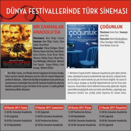 Her ay düzenlenen etkinliklerle, yeni kuşak genç sinemacıların üretimlerinin çeşitli workshoplar ve oyuncu katılımlarıyla sinemaseverlerle buluşturulması hedefleniyor. Dünya festivallerinde gösterilip birçok ödül alan filmlerden “Bir Zamanlar Anadolu’da”, “Çoğunluk”, “Köprüdekiler” ve “Pandora’nın Kutusu” Kasım ayı etkinlikleri kapsamında Konak Kültürevi Serdar Şafak Sahnesi’nde gösterime girecek. 18-24 Kasım tarihleri arasında yapılacak film gösterimleri 12.00, 15.00, 18.00 ve 20.30 seanslarında izlenime sunulacak. Sinemaseverler, gösterimde olacak filmleri 5 TL indirimle 3 TL karşılığında izleyebilecek.
