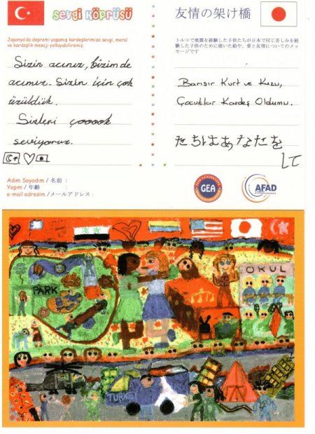 Başbakanlık Afet ve Acil Durum Yönetimi Başkanlığı ile GEA Yeni Yüksektepe Kültür Derneği arasında yapılan protokol gereği, depremi yaşamış Japon çocuklarına bir sevgi ve kardeşlik mesajı ulaştırmak, onların yanında olarak, resimler ve mesajlar ile sevgi köprüsü kurmak amaçlandı. 23 Nisan haftasında Bursa’da başlatılan ‘Sevgi köprüsü’ tamamlandı. Proje kapsamında Bursalı çocuklar 355 resim, 2 bin 421 adet hazır karta mesaj yazarak duygularını anlattı. Ayrıca 39 çocuk ise kendi hazırladıkları kartpostallarına sevgi mesajlarını yazarak Japon arkadaşlarına mesajlarını ulaştırmaya çalıştı.