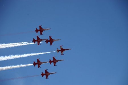 Türk Hava Kuvvetleri'ne bağlı hava ekibi olan 134. Akrotim Filo Komutanlığı bünyesindeki pilotların kullandığı yedi tane jet uçağı, Milas-Bodrum Havalimanı'ndan kalkarak saat 13.00'te Muğla semalarında gösteriye başladı. Türk Yıldızları'nı seyretmek ilçelerden de çok sayıda vatandaş gelirken gösteri alanı olan Atatürk Bulvarı’nın etrafı tamamen doldu. Vatandaşlar, Türk Yıldızları'nı görebilmek için Dirgeme köyü yolu, Yılanlı yolu ve Marmaris karayolu üzerinde uzun kuyruklar oluşturdu. 25 dakika süren gösteride Muğla Ovası üzerinde zaman zaman 100 metreye kadar alçalan jetler, ilk olarak toplu geçiş yaptıktan sonra ferdi ve ikili üçlü gösteriler yaptı. Saat 13.25’te gösteriyi tamamlayan Türk Yıldızları, tekrar Milas-Bodrum Havalimanı'na döndü. CİHAN