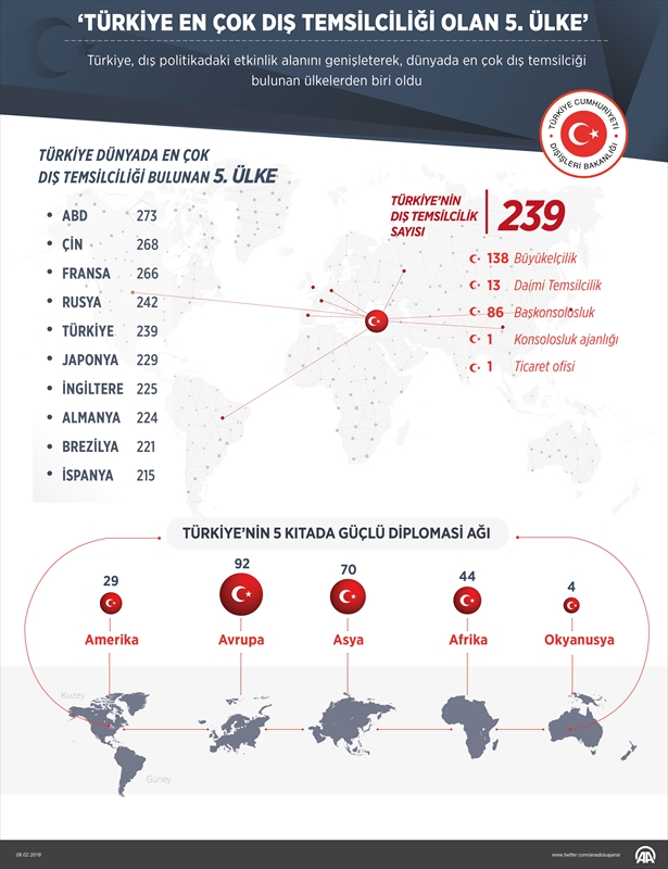 En çok dış temsilciliği olan ülkeler arasında Türkiye 5. sırada. Türkiye'nin 5 kıtada 138 büyükelçilik, 86 başkonsolosluk, 13 daimi temsilcilik, bir ticaret ofisi, bir de konsolosluk ajansı var. Yurt dışı temsilciliklerde 4 bin 506 personel görevli.