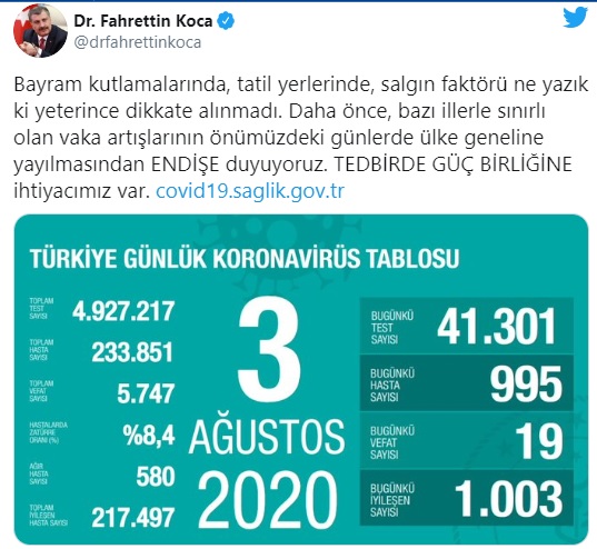 Sağlık Bakanlığı'nın internet sitesinde yer alan ve Bakan Fahrettin Koca'nın da Twitter'dan paylaştığı, "Türkiye Günlük Koronavirüs Tablosu"nun güncel verilerine göre, bugün 41 bin 301 test yapıldı, 995 kişiye Kovid-19 tanısı konuldu. Son 24 saatte 19 hasta vefat etti.