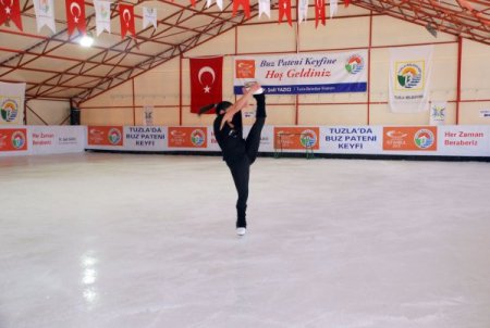 Tuzla'da buz pateni pistinin açılışında profesyonel patenciler de küçük bir gösteri sundu. CİHAN...