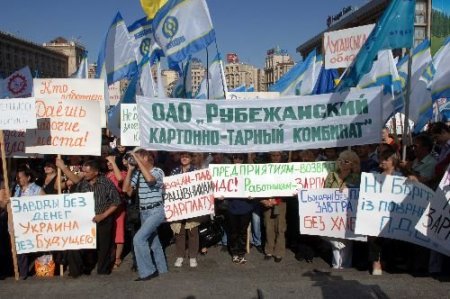 Eylemciler ellerinde; "Aylığımız düştü, fiyatlar arttı.", "Aylığımızı ödeyin", "Hıristiyan olan emeğin karşılığı verir" gibi çeşitli sloganlar yazan döviz ve pankartlar taşıdı. Eyleme katılmak için başkentin 350 kilometre doğusundaki Poltava kentinden gelen Sergey Rezniy Cihan'a yaptığı açklamada: "Geçtiğimiz iki ay içerisinde bin 400 kişi işten atıldı. Fabrika sahipleri başka şehirlerden ve bizim işsiz kalmamız onları çok ilgilendirmiyor. Mahkemeye verdik hakkımızı arıyoruz" dedi.
