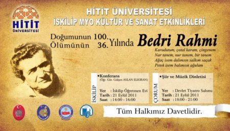 Hitit Üniversitesi İskilip Meslek Yüksekokulu Kültür ve Sanat Etkinlikleri kapsamında Çorum Valiliği, Çorum Belediyesi, İskilip Kaymakamlığı ve İskilip Belediyesi tarafından ''Doğumunun 100., Ölümünün 36. Yılında Bedri Rahmi'' adlı program düzenlenecek. 21 Eylül Çarşamba günü gerçekleştirilecek ve iki bölümden oluşan programın ilki İskilip Öğretmenevi’nde, ikincisinin ise Çorum Devlet Tiyatro Salonu’nda gerçekleştirileceği öğrenildi.