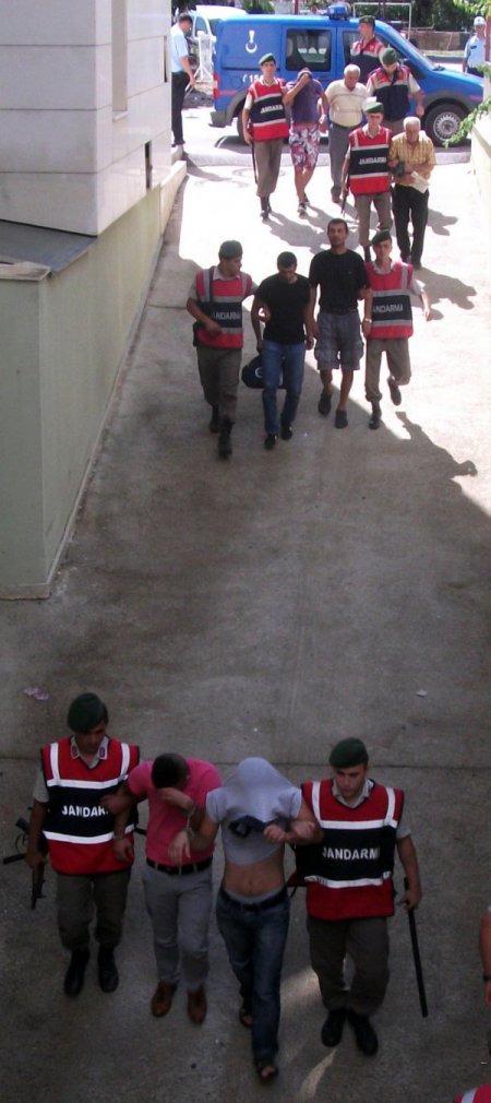 Konya ve Eskişehir illeriyle Antalya’nın Alanya, Manavgat ve Gündoğmuş ilçelerinde 4 ay boyunca teknik ve fiziki takibe alınan şahıslar, dün sabah belirlenen 15 adrese yapılan operasyonlarla göz altına aldı. Zanlıların adreslerinde yapılan aramalarda 5 kilogram esrar maddesi, 5 av tüfeği ve 1 adet tabanca ile mühimmat ele geçirildi. Tahkikatta yaklaşık 100 kişinin de bilgisine baş vurulduğu öğrenildi. Göz altına alınan C.A., E.Ş., M.B., A.K., V.A., Ö.G., V.A., A.D., A.R., N.Y., F.A., U.I., S.B., M.G. ve A.S. adliyeye sevk edildi.
