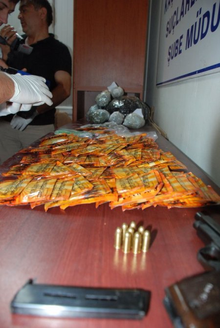 Sabri O.'nun elindeki çantada ve yapılan üst aramasında 2, 5 kilo esrar, bin 672 uyuşturucu hap, 1 ruhsatsız tabanca ve 90 paket bonzai adlı uyuşturucu madde ele geçirildi. Gözaltına alınan ve 9 ayrı suçtan kaydı bulunan Sabri O.'nun ifadesinde içi uyuşturucu madde dolu çantayı bir caminin avlusunda bulduğunu söylediği öğrenildi. Emniyetteki ifadesi tamamlanan Sabri O., "Uyuşturucu madde ticareti yapmak" suçundan adliyeye sevk edildi.