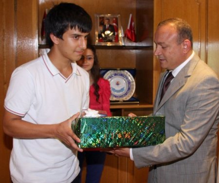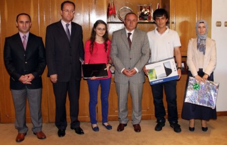 Vali Kızılcık, TÜBİTAK tarafından yapılan yarışmada üçüncü olan öğrenciler Aleyna Calap ve Berkay Akdere’ye bilgisayar hediye verirken, öğretmenleri Cavidan Semercioğlu’nu da ödüllendirdi.
