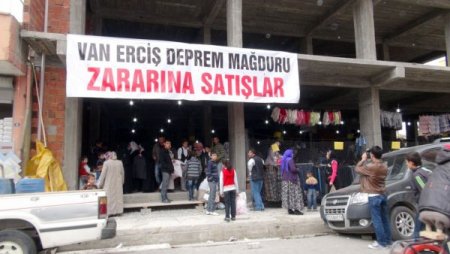 Kısmet Mahallesi 8. Cadde üzerinde boş bir inşaata koydukları mallarını satan Vanlı esnaf "Van Erciş deprem Mağduru zararına satışlar başlamıştır" pankartı asarak, Batmanlılardan destek istedi.