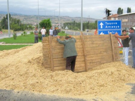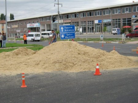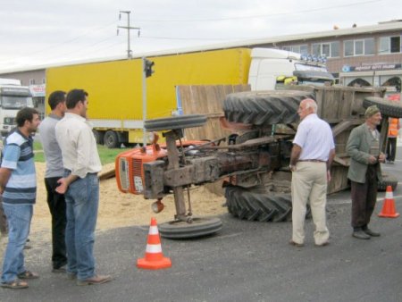 Tokat’ın Erbaa ilçe girişinde bulunan kavşak yine bir kazanın yaşanmasına neden oldu. 60 KA 141 plakalı traktör sürücüsü ilçe merkezine girmek istedi. Hızını kesmeyen traktör sürücüsü viraja hızlı girince, traktörün kasasında bulunan samanla birlikte devrildi. Kazada ölen ya da yaralanan olmazken, Yola dökülen saman vatandaşında yardımıyla iki saatlik bir çalışmanın ardından kaldırılabildi.