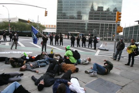 Birleşmiş Milletler binasının önünde izinsiz gösteri yapan 5 Wall Street protestocu gözaltına alındı. ABD’deki gelir dağılımın dengesizliğini, Wall Street bankalarını ve ekonomik politikaları protesto eden Wall Street protestocuları bu sefer New York’ta bulunan BM binasının önünde izinsiz gösteri yaptı.