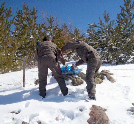 Kayseri’de ağır geçen kış şartlarında aç kalan yaban hayvanları için doğaya yem bırakıldı. 3 ton sakatat, 1 ton ay çekirdeği, 500 kilo buğday açık arazilere dağıtıldı.