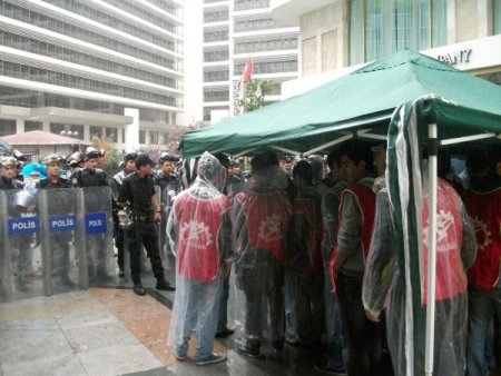 İstanbul’da etkisini gösteren sağanak yağmur, çevik kuvvet ekiplerini olumsuz etkiledi. Polis, işten atılan 123 işçinin geri alınması için çadır kurmak isteyen Elektrik, Gaz, Su ve Baraj Çalışanları Sendikası (Enerji-Sen) üyesi grubu BEDAŞ’a yakın bir mesafede durdurdu. Çevik kuvvet barikatıyla karşılaşan işçiler oturma eylemine başladı. Eylem sırasında aniden yağmur bastırınca işçiler BEDAŞ önünde açacakları çadırı polis barikatının önüne kurdu. İşçiler ıslanmaktan kurtulurken, yağmura hazırlıksız yakalanan çok sayıda çevik kuvvet polisi ise sırılsıklam oldu.