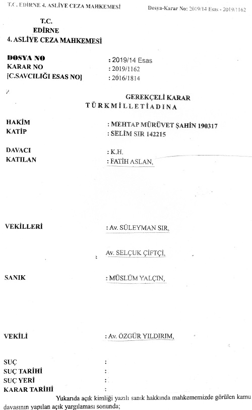 Edirne 4. Asliye Ceza Mahkemesi’nin 2019/1162 karar nolu gerekçeli kararını sizlere noktasına virgüle dokunmadan aşağıda aktarıyorum: