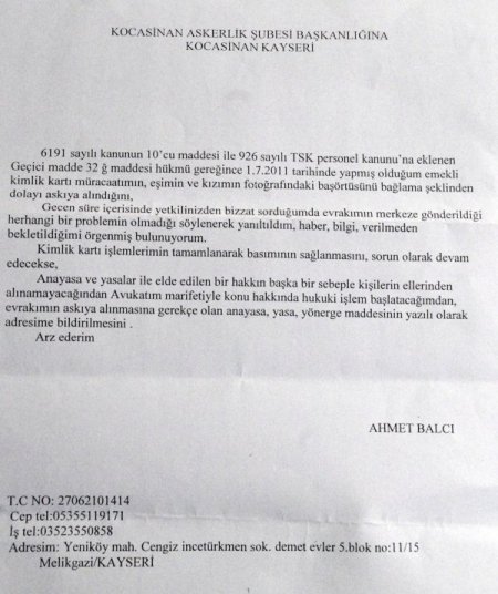 Türk silahlı Kuvvetleri’nden (TSK), Yüksek Askeri Şura (YAŞ) kararlarıyla atılan askeri personel Anayasa’da yapılan değişiklik sonrasında hakları iade ediliyor. Bu haklar arasında yer alan kimlik kartlarında ise sorun çıktı. Askerlik Şubesi’ne ailece başvurarak kimlik kartı almak isteyen askeri personelin eşlerine başörtülü oldukları gerekçesiyle kimlik verilmedi CİHAN