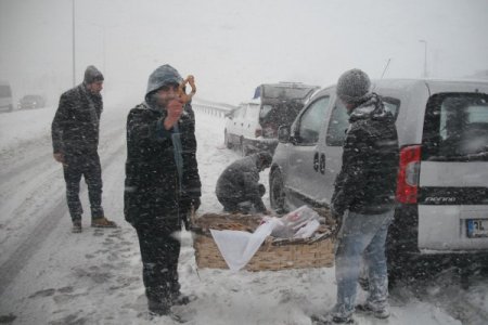 Kar yağışı ve buzlanma sebebiyle çok sayıda aracın yolda kalmasını seyyar simitçiler de fırsata çevirdi. Soğuk hava ve tipi altında sepetine aldığı simitlerle yolda kalan vatandaşların imdadına yetişen seyyar simitçi, sabahtan beri ikinci sepeti bitirdiğini söyledi. Simitçi Mehmet Refik, "Vatandaşa hizmet ediyoruz. Yolda kalanlara ve aç kalanlara simit servisi yapıyoruz." dedi.