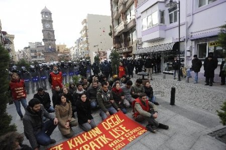 Kaldırımlarda ve parklarda çadır kurdukları için gözaltına alınan, ardından serbest bırakılan grup üyeleri, bugün de Saat Kulesi’nin yanında basın açıklaması yapmak istedi. Basın açıklamalarına izin verilen Cumhuriyet Meydanı’nı istemeyen grup, vatandaşların en kalabalık olduğu yer olan Saat Kulesi Meydanı’nı tercih edince polis izin vermedi. Eylemciler, bunun üzerine yolun ortasında birbirlerine kenetlenerek slogan atmaya başladı. Polislerin uyarılarına rağmen oturma eylemi başlatan gruba, çevredeki vatandaşlar tepki gösterdi. Sloganların gürültüsü sebebiyle yan tarafta bulunan dershanedeki öğrenciler de pencerelere çıkarak olanları seyretmeye başladı. Bir vatandaş ise gruba yaklaşarak, “Kendinize Liseli Dev Genç adını vermişsiniz ama görüyorum ki içinizde hiç liseli yok.” dedi. Vatandaşı, polisler olay yerinden uzaklaştırdı.