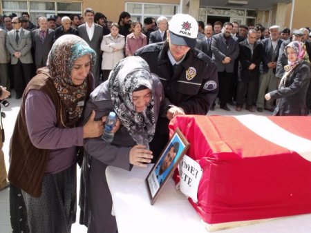 Yerköy İlçe Emniyet Müdürlünde görevli komiser Bahattin Omak, şehit polis Mehmet Mete’nin öz geçmişini okuduğu sırada eşi Fatma Mete, baba Abdullah Mete ve akrabaları göz yaşlarına boğuldular.