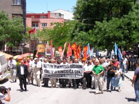 Çeşitli sol örgütlerin de desteklediği Ankara Emek, Demokrasi ve Özgürlük Bloğu üyesi yaklaşık 50 kişi YSKönünde toplandı. “Kürtlere ve demokrasi güçlerine yönelik ayrımcılığa son” pankartı taşıyan grup, “Barajı yıktık sıra sistemde”, “Dicle’ye özgürlük vekilime dokunma” sloganları attı. Eylem nedeniyle polis ekipleri YSKönünde yoğun güvenlik önlemleri aldı. Polis grubu YSK binası yakanının da durdurdu.