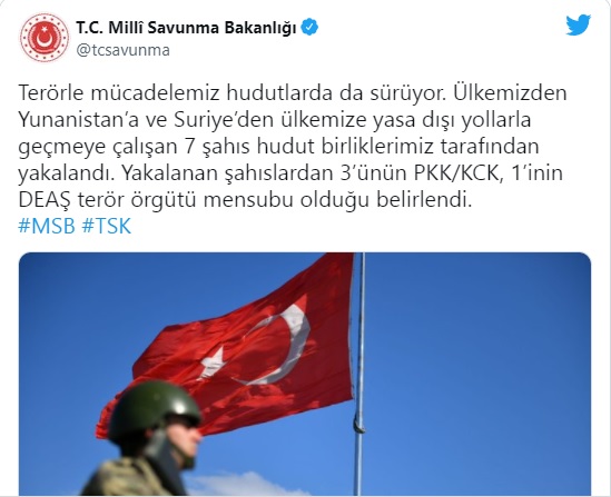 "Terörle mücadelemiz hudutlarda da sürüyor. Ülkemizden Yunanistan'a ve Suriye'den ülkemize yasa dışı yollarla geçmeye çalışan 7 şahıs hudut birliklerimiz tarafından yakalandı. Yakalanan şahıslardan 3'ünün PKK/KCK, 1'inin DEAŞ terör örgütü mensubu olduğu belirlendi."