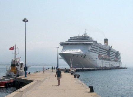 İtalyan, Fransız, İspanyol ve Rus ağırlıklı toplam 33 ülkeden turistlerle yola çıkan gemi, 3 gün önce İtalya Saravona Limanı'ndan demir aldıktan sonra Alanya Limanı’na geldi. 14 katlı lüks kruvaziyer gemisi 'Costa Mediterranea' yolcuları bugün akşam saatlerine kadar Alanya Kalesi, Dim Çayı, Kızılkule ve turistik yerleri ziyaret edecek. Bazı turistlerde şehir çarşısını gezerek alışveriş yaptı. Karavan Turizm’in Akdeniz Bölge Müdürü Sami Simi, 'Costa Mediterranea' gemisinin eylül ayının 12’sinde tekrar turist getireceğini söyledi. Her yıl Alanya’ya 6 sefer yaparak turist getirdiklerini belirten Simi, getirilen turistlerin Türkiye’ye çok büyük ekonomik katkısı olduğunu söyledi. Simi, hem tanıtım hem de ekonomik olarak Türkiye ekonomisine büyük katkı sağlayan kruvaziyer gemilerinin özellikle esnafa katsının büyük olduğunu ifade etti. Ortalama 2 bin 500 kişiden yılda 17 bin civarında turisti Alanya’ya getirip ziyaret ettirdiklerini belirten Simi, 'Costa Mediterranea' gemisinin bugün akşam saat 07.00’de hareket ederek sabah aynı saatte Marmaris Limanı'na demir atacağını söyledi.