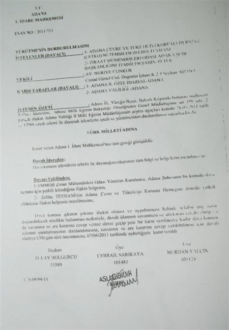 Adana 1. İdare Mahkemesi, Çukurova Üniversitesi’nin ‘Zeytin Gen Merkezi’ dediği alanda İl Özel İdaresi’nin okul yaptırılması ile ilgili kararının yürütmesini durdurdu. Çevre ve Tüketiciyi Koruma Derneği ile Ziraat Mühendisleri Odası Adana Şubesi’nin Adana 1. İdare Mahkemesi’ne yaptığı başvuru karara bağlandı. Mahkeme, Adana İl Özel İdaresi’nin Zeytin Gen Merkezi olduğu iddia edilen sahada Fen Lisesi inşaatı yaptırılması konusunda yürütmenin durdurulması kararı aldı.